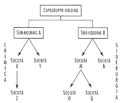 - Società che detengono a loro volta altre partecipazioni (c.d. “sub-holding“, come la “A” nel medesimo settore chimico e la “B” diversificando il business nel settore siderurgico. Come rappresentato nell’immagine);